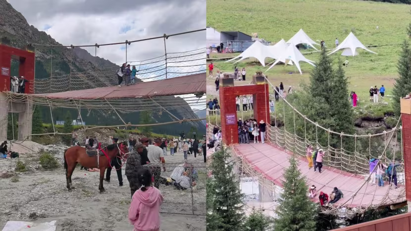 Footage circulating on Chinese short-video platform Douyin showed the bridge tilted to one side in the aftermath. In one clip, stranded tourists could be seen clinging to the remaining suspended side of the bridge, attempting to cross to safety.