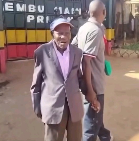 He donned a grey suit, a pink shirt, a navy blue cap, and brown footwear. Picked out by his family from Embu Main Prison, the elderly guy stood alongside a man who appeared to be his son, holding his hand.