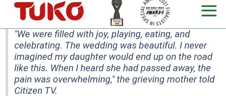 Mary Masakhwe, the bride’s mother, tearfully described her shock and grief over her daughter’s sudden death following the joyful wedding. The Kakamega Bride died in a fatal car accident, which involved a family car, a speeding tractor, and a truck. The collision caused severe damage to all three vehicles.