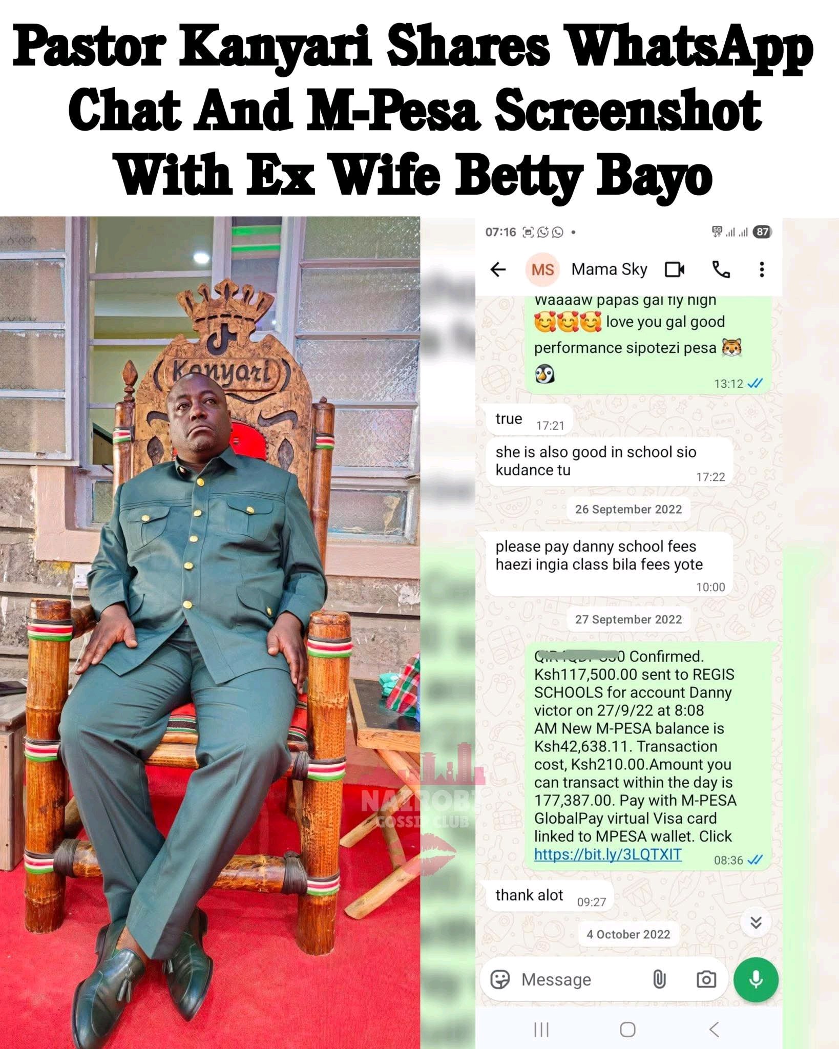 Pastor Victor Kanyari has once again stirred online discussions after posting screenshots of a WhatsApp exchange and an M-Pesa transaction involving his ex-wife, gospel singer Betty Bayo.