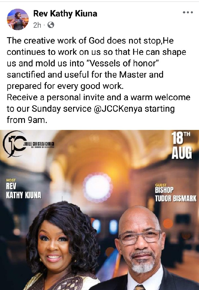 Receive a personal invite and a warm welcome to our Sunday service JCC Kenya starting from 9 am.” For full details, you can view her post here.